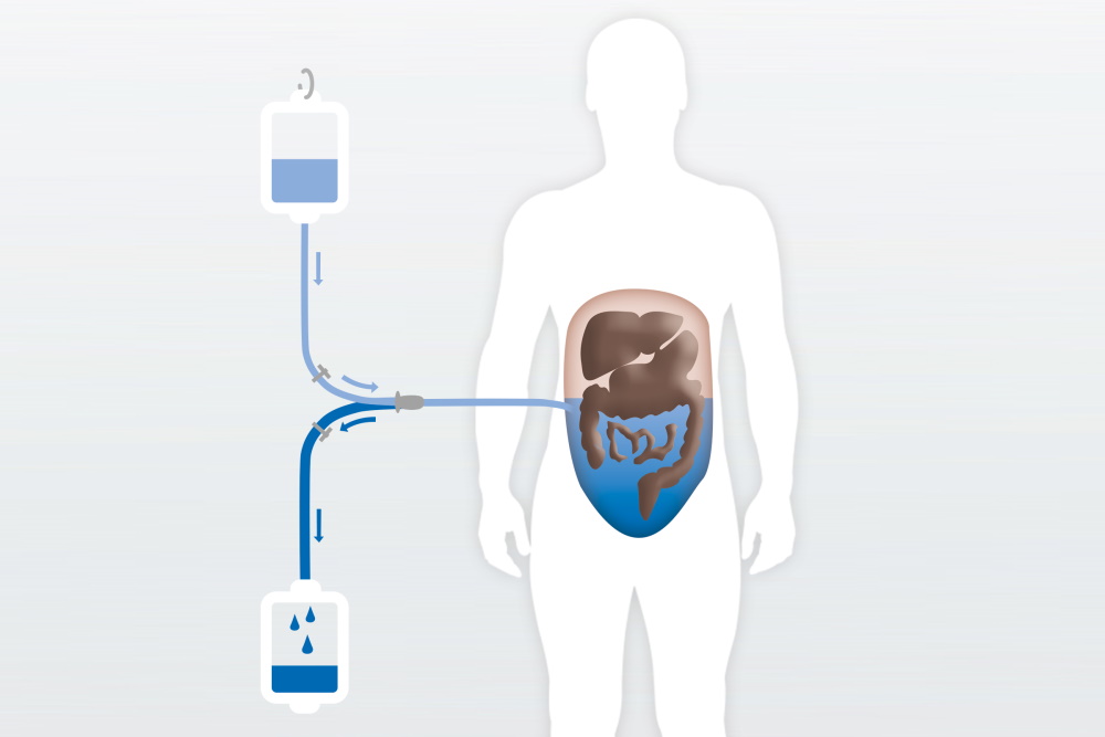 Die Lösung fließt über ein Schlauchsystem in den Katheter, der im Rahmen eines kleinen chirurgischen Eingriffs in die Bauchhöhle eingesetzt wurde.