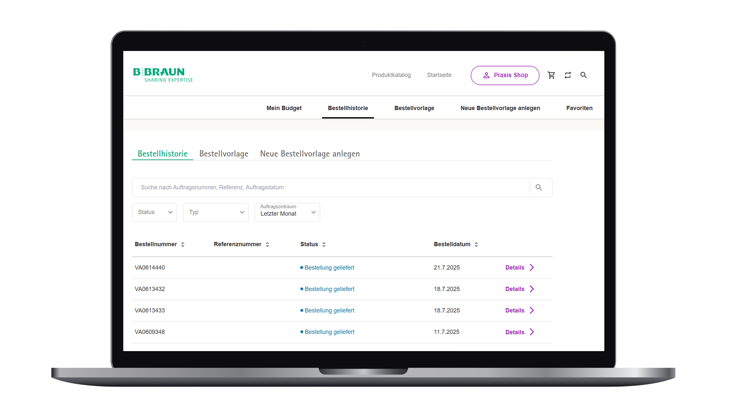 Digitalisieren Sie mit uns Ihren Bestellprozess von Artikeln des Praxis- und Sprechstundenbedarfs. Behalten Sie dabei Ihre Bestellungen und Ihr Budget im Überblick und verfolgen Sie jederzeit Ihren Bestellstatus. Mit dem B. Braun Praxis-Shop bleiben Sie up-to-date und haben eine Plattform für Ihre Versorgung.
