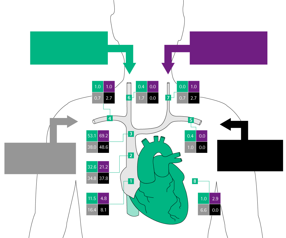 | Rechter Vorhof oder Vena Cava Inferior | 18 | 5,5 % | 5,6 % |
